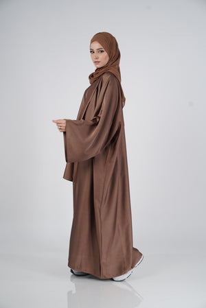 Introducing an exquisite abaya and headscarf set meticulously crafted from 100% Korean silk. The fabric undergoes a unique crinkling and washing process, resulting in a subtle metallic sheen that imparts a distinctive character. Available in a palette of five exquisite colors, each piece is meticulously handcrafted with the utmost attention to detail and finished with the highest quality stitching.